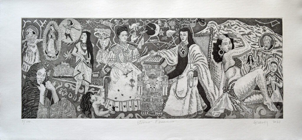 Obra Gráfica Trabajos en diferentes técnicas: Calcografía, Lineografía, Litografía, Monotipia, Serigrafía, Xilografía. -Las medidas señaladas corresponden al tamaño de la imagen impresa- “Danza de los Tecuanes” 1990 49 x 33.5 cm Calcografía “De feria” 1993 18 x 30 cm Calcografía “El abuelo” 1988 16 x 11 cm Calcografía “Jacqueline Voltaire” 2008 29 x 22 cm Calcografía “El turistita” 2002 33 x 24 cm Linoleografía “El cieguecito” 2002 33 x 24 cm Linoleografía “El de peyotes” 2002 33 x 24 cm Linoleografía “Divino Niño Jesús de las Palomitas” 2000 56.5 x 38.5 cm Serigrafía “Sto. Niño de Atocha” 2000 58 x 40 cm Serigrafía “Santo Niño de Santa Rosa” 1999 41 x 28 cm Serigrafía “Santo Niño Pintorcito” 2003 31 x 24 cm Calcografía y xilografía “Hechicero” 1992 48.5 x 29.2 cm Linoleografía “Descuajeringado” 2002 33 x 24 cm Linoleografía “Virgen de Guadalupe” 2015 29 x 18 cm Linoleografía “El escudo de Patti Smith” 2011 27 x 27 cm Calcografía “Santa Rosa luchando con el demonio” 2011 26 x 20 cm Calcografía “Fervorosos afectos” 2014 24 x 24 cm Calcografía “Nuestra madrecita” 1998 80 x 62 cm Serigrafía “Las del talón” 2007 54 x 50 cm Serigrafía “San Antonio” 1990 22.4 x 11 cm Calcografía “Niño Doctor” 1990 34 x 30 cm Calcografía “Santa Rosita” 2016 14.5 x 10 cm Calcografía “El amor es una cosa…” 1992 20 x 30 cm Litografía “La morena” 1994 38 x 56 cm Litografía “Los Quetzales” 1994 38 x 56 cm Litografía “Pirámide de Cholula” 1992 33 x 29 cm Litografía “Sister Bowie V/VIII” 2020 38 x 28 cm Estampa intervenida con HolyWatercolor “Sister Bowie VII/VIII” 2020 38 x 28 cm Estampa intervenida con HolyWatercolor “Sister Bowie VII/VIII” 2020 38 x 28 cm Estampa intervenida con HolyWatercolor “Eterno Femenino” 2021 23 x 60 cm Impreso en papel de algodón 100% Técnica de “Grabado en Metal”